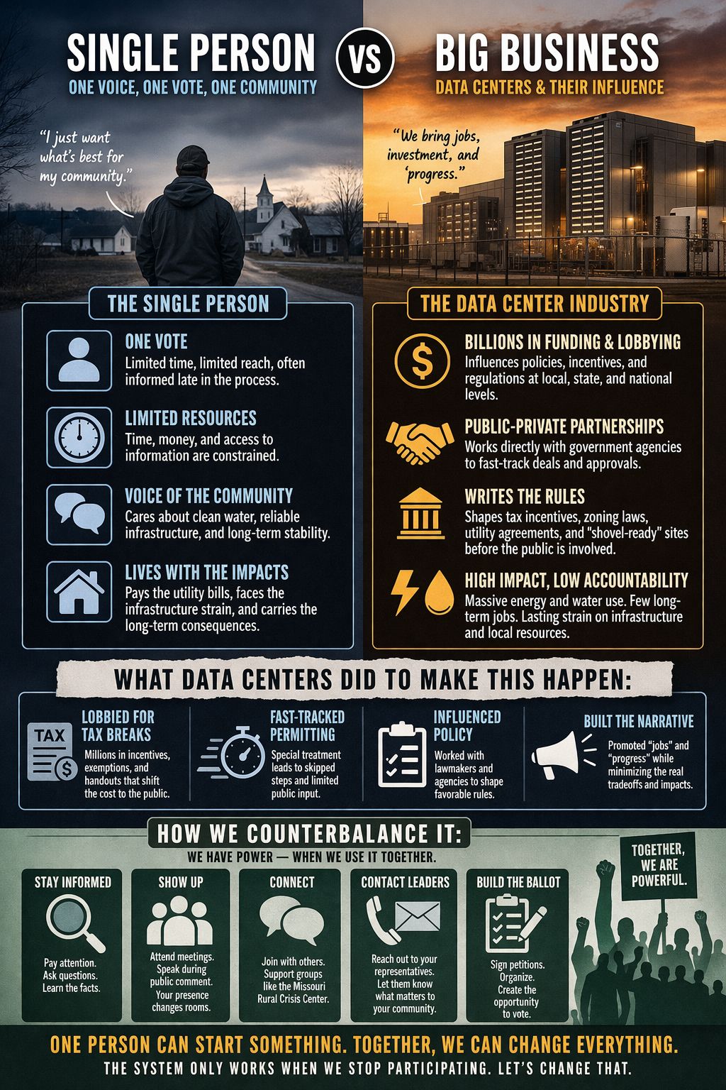 Groups like the Missouri Rural Crisis Center are working with community members to increase awareness, encourage participation, and bring attention to the impact of large-scale development decisions.